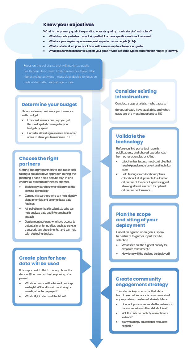 While low-cost sensor networks can be easier and more cost-effective to implement than a traditional monitoring network, their successful implementation still requires a good deal of planning. We provide an overview of the steps that should be taken to ensure a successful deployment below here—for more detail, our full Guide to Leveraging Low-cost Sensors for Air Quality Monitoring 2.0 is available for download here.