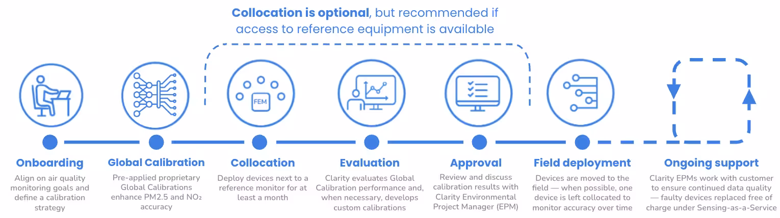 Although IoT-based air quality sensors generally require less maintenance than traditional monitors, they do still require calibration to ensure reliable measurement. Calibration involves tuning the air quality sensor’s output to more closely match reference monitor readings. Clarity offers remote calibration free of charge as a part of our Sensing-as-a-Service offering.
